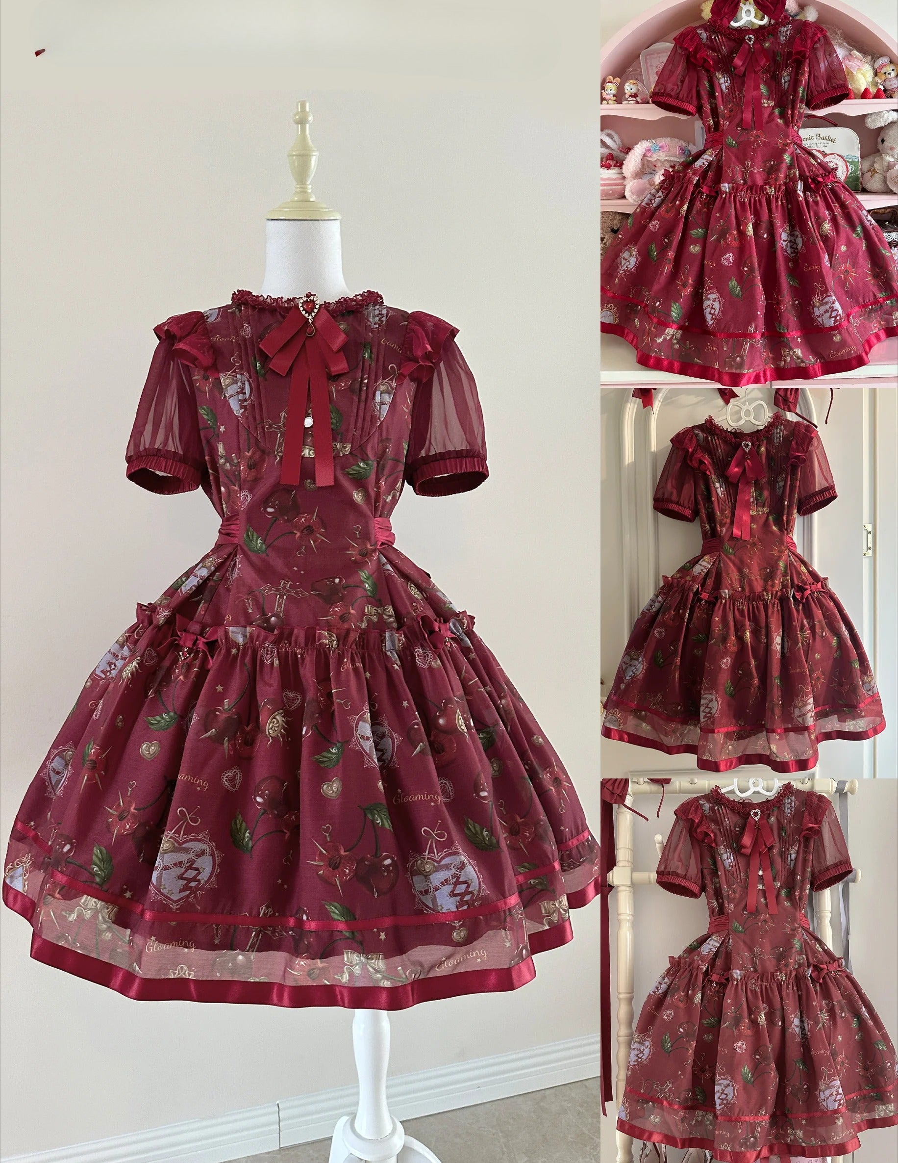 Details: The skirt is richly decorated with cherries, bows, and floral motifs, lending a nostalgic yet vibrant feel. Each colorway has coordinating ribbon trims along the neckline, hem, and bodice details, emphasizing the color contrast and intricate pattern. The dress has puff sleeves for the OP style and adjustable shoulder straps for the JSK, offering versatility and comfort. A large satin bow ties at the back, creating a fitted silhouette and adding a touch of elegance. The hem is finished with lace edging, enhancing the dress’s layered look and completing its classic Lolita appeal.