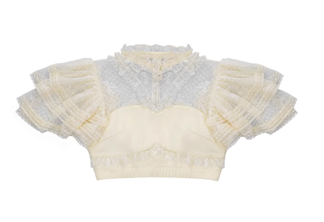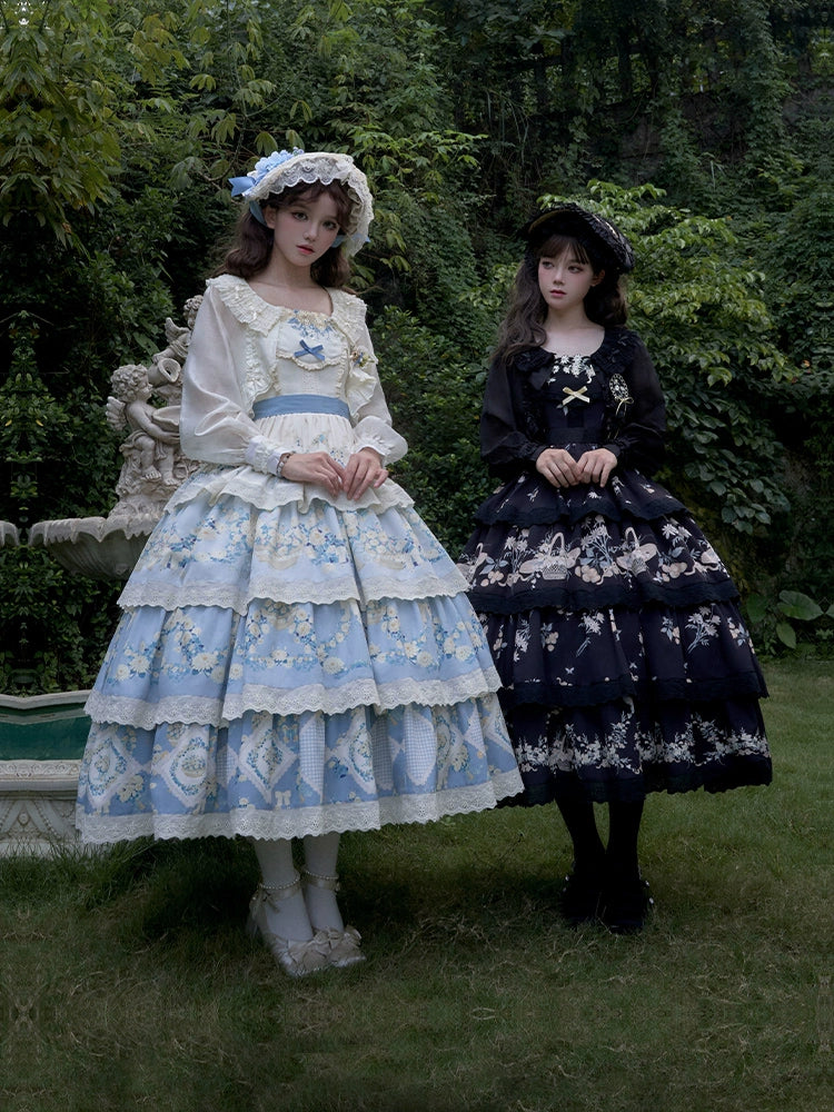 Design Elements: This JSK features a classic pastoral theme with elegant floral embroidery across a tiered skirt. Each layer is adorned with delicate lace trim, creating a refined, vintage look. The wide straps have ruffled edges, and a soft ribbon decorates the bodice, emphasizing a romantic, fairytale aesthetic.