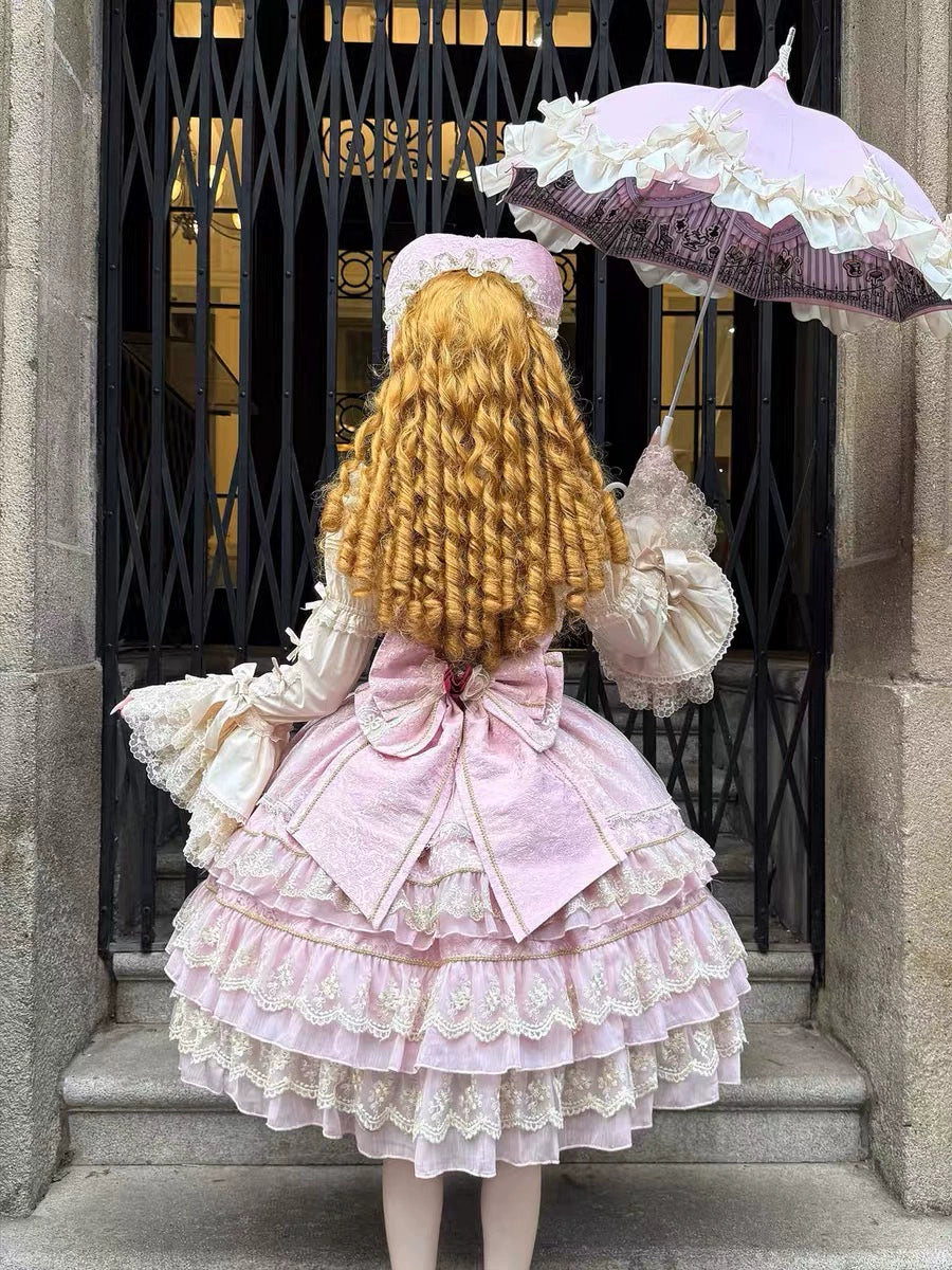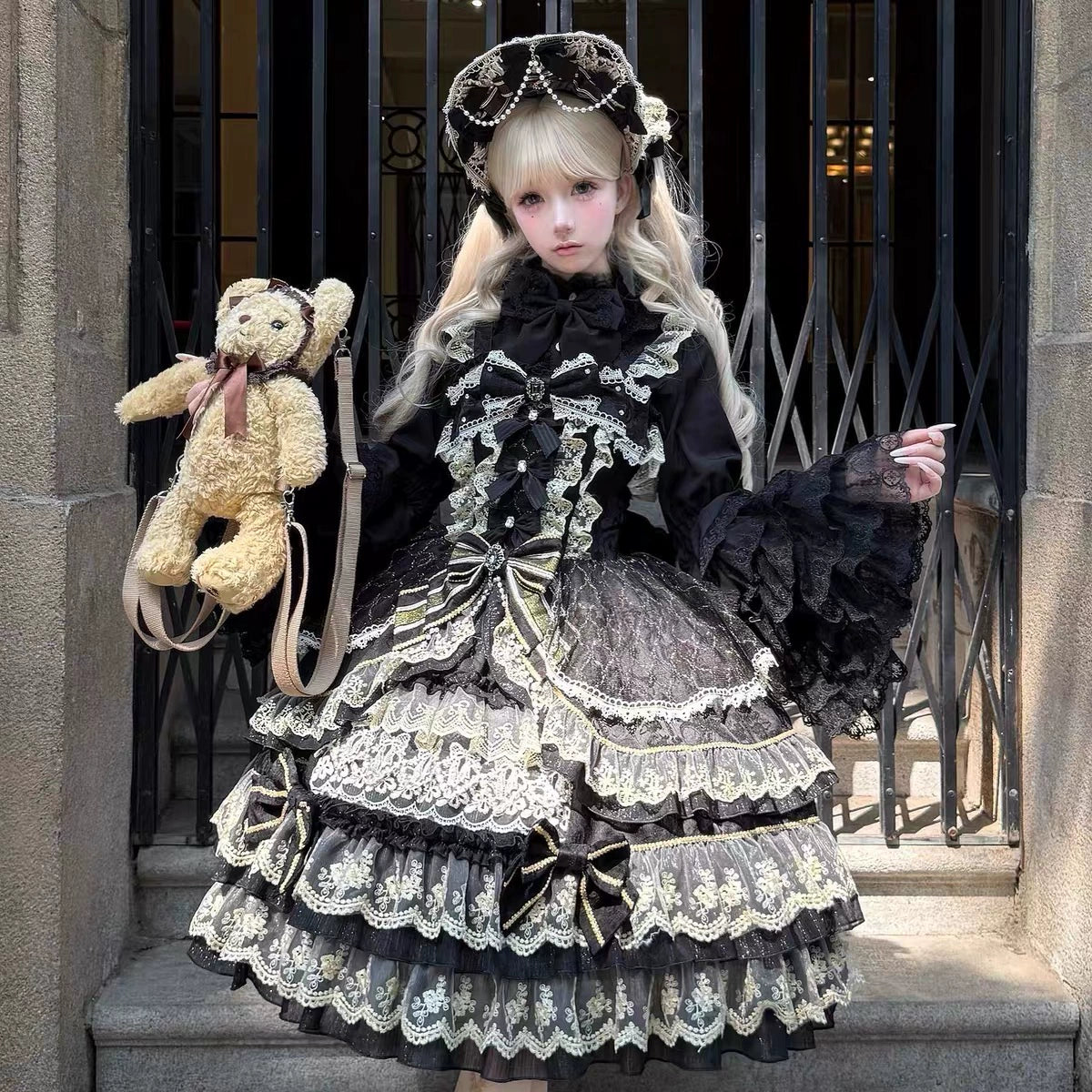 Design Elements: This exquisite Lolita JSK features a charming teddy bear print. The bodice is structured with delicate lace details and ruffled trims along the neckline and sleeves. Large bows accentuate the hem and waistline, creating a layered, feminine silhouette. The broad waist ties are adjustable, ensuring a snug and comfortable fit.