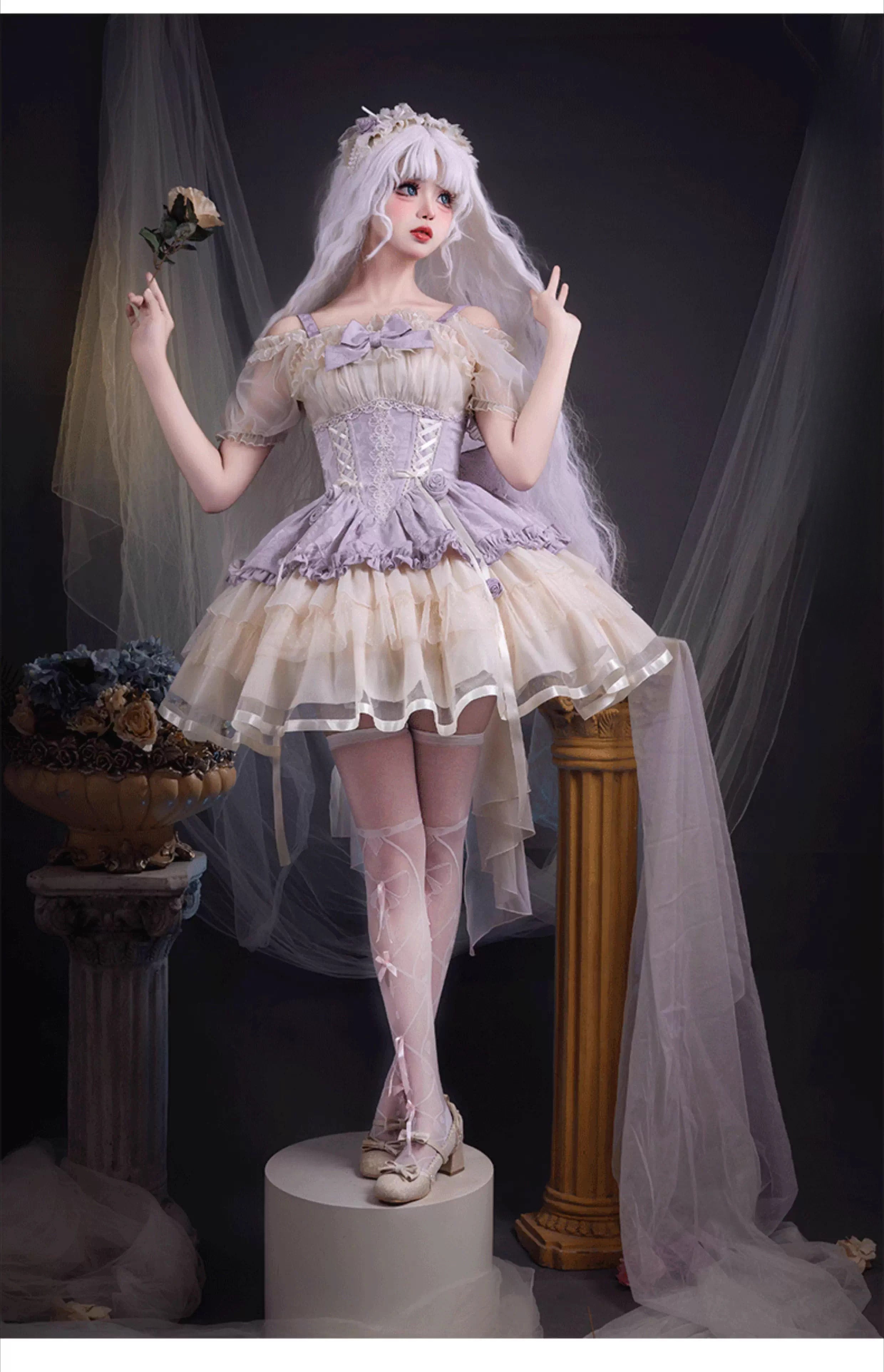 Details: The bodice is intricately finished with delicate pintucks and a scalloped lace trim, crowned by a smaller coordinating bow at the sweetheart neckline. The sleeves feature delightful eyelet lace panels, trimmed with more of the signature floral lace and a charming ruffle. Beneath the tiered overskirt, a smooth, lustrous underlayer catches the light. Every aspect, from the subtle texture play to the cohesive color palette, exudes a timeless sweetness and refined Lolita elegance.