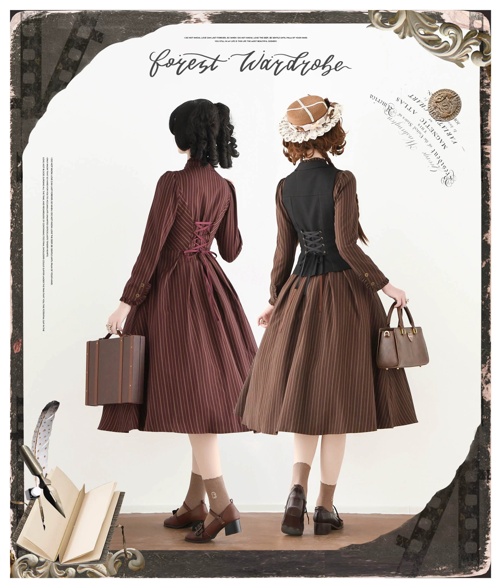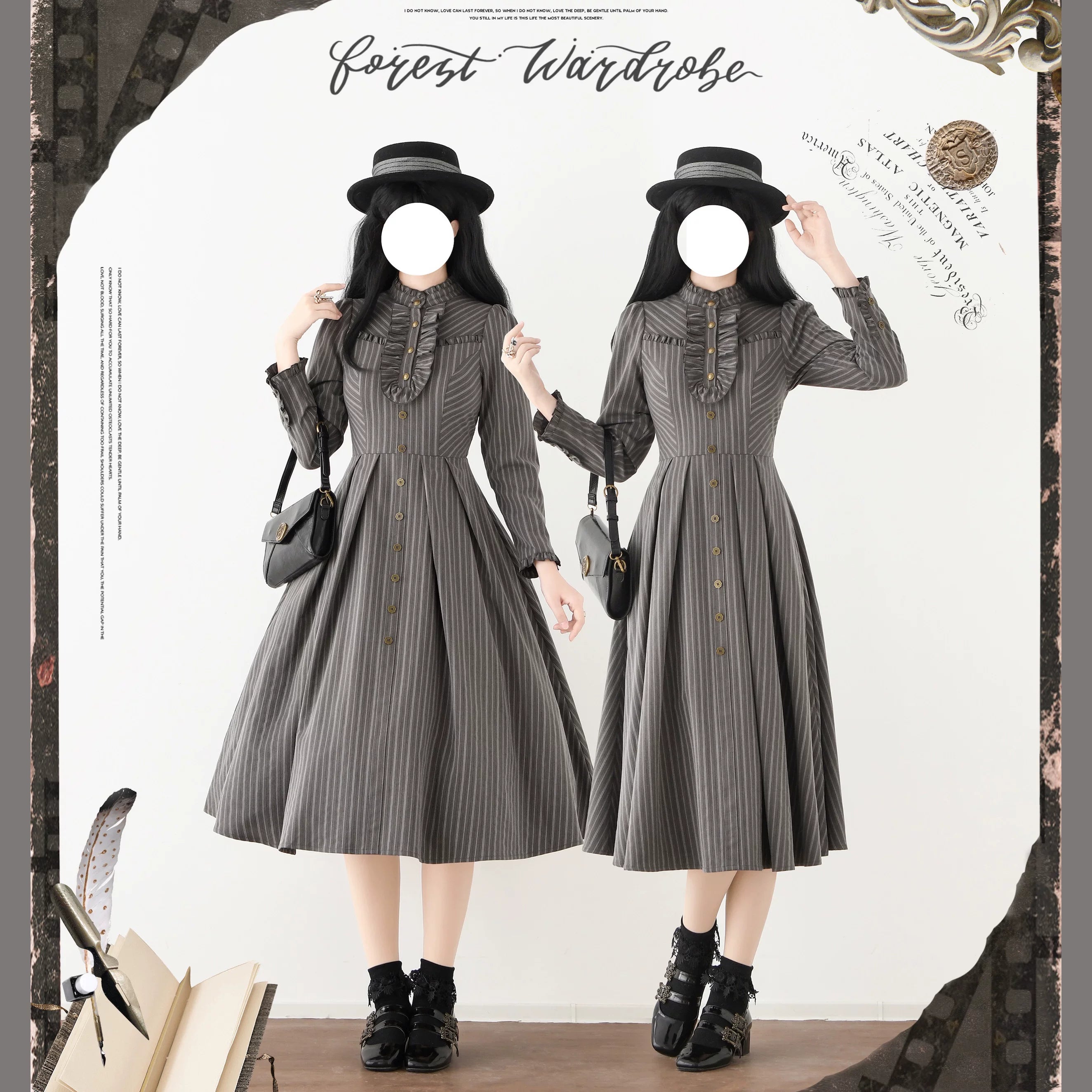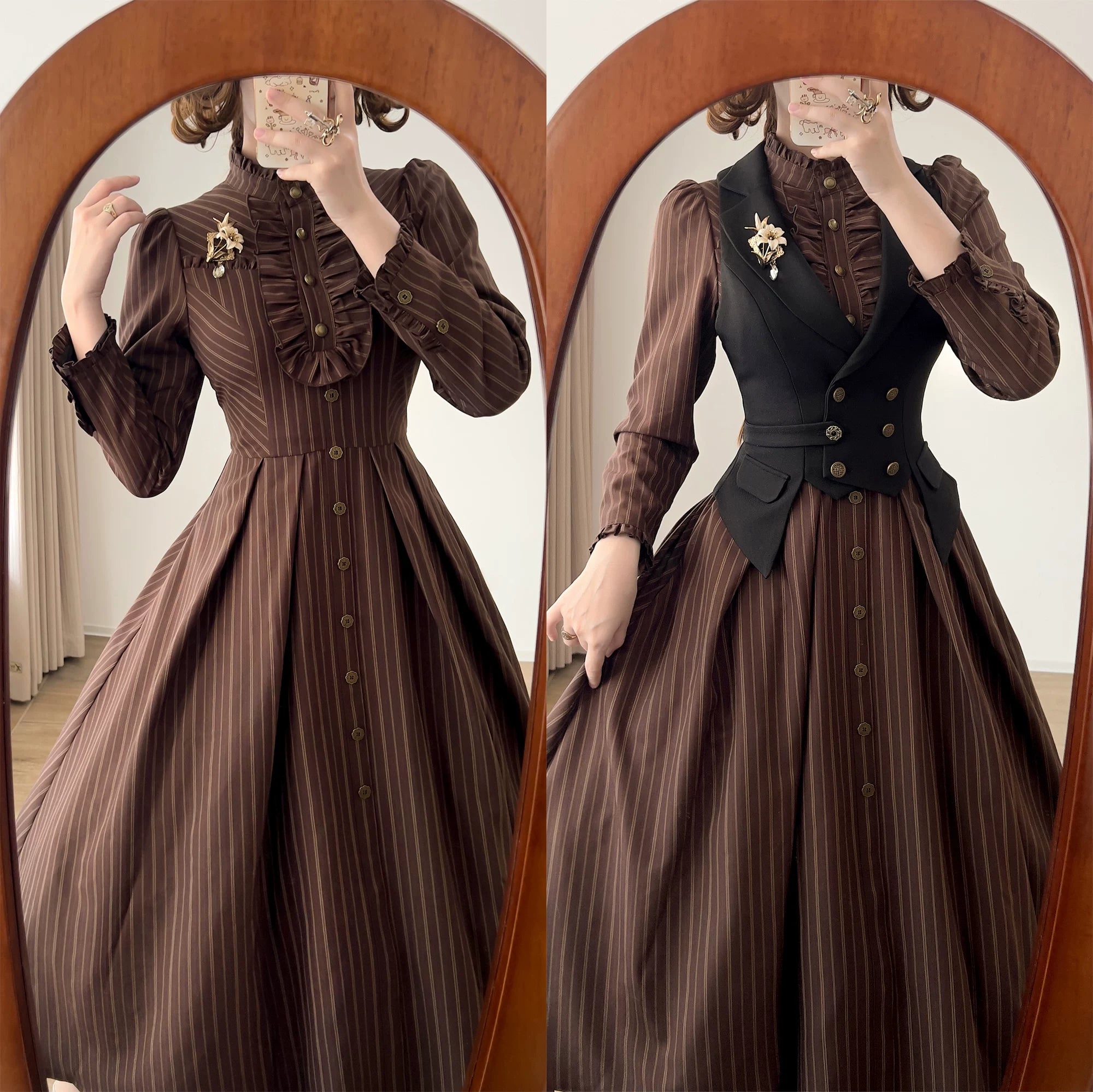 Design Elements: This ensemble features a high-necked, double-breasted vest with structured peak lapels, paired with a long-sleeved shirt dress showcasing delicate pintucking along the bodice. A voluminous, tiered skirt creates a dramatic silhouette, complemented by a detachable waist corset detailed with metallic eyelets and vertical boning. Ruffled cuffs and a Peter Pan collar add feminine flourishes, while a matching belt with an ornate buckle cinches the waist for architectural definition.