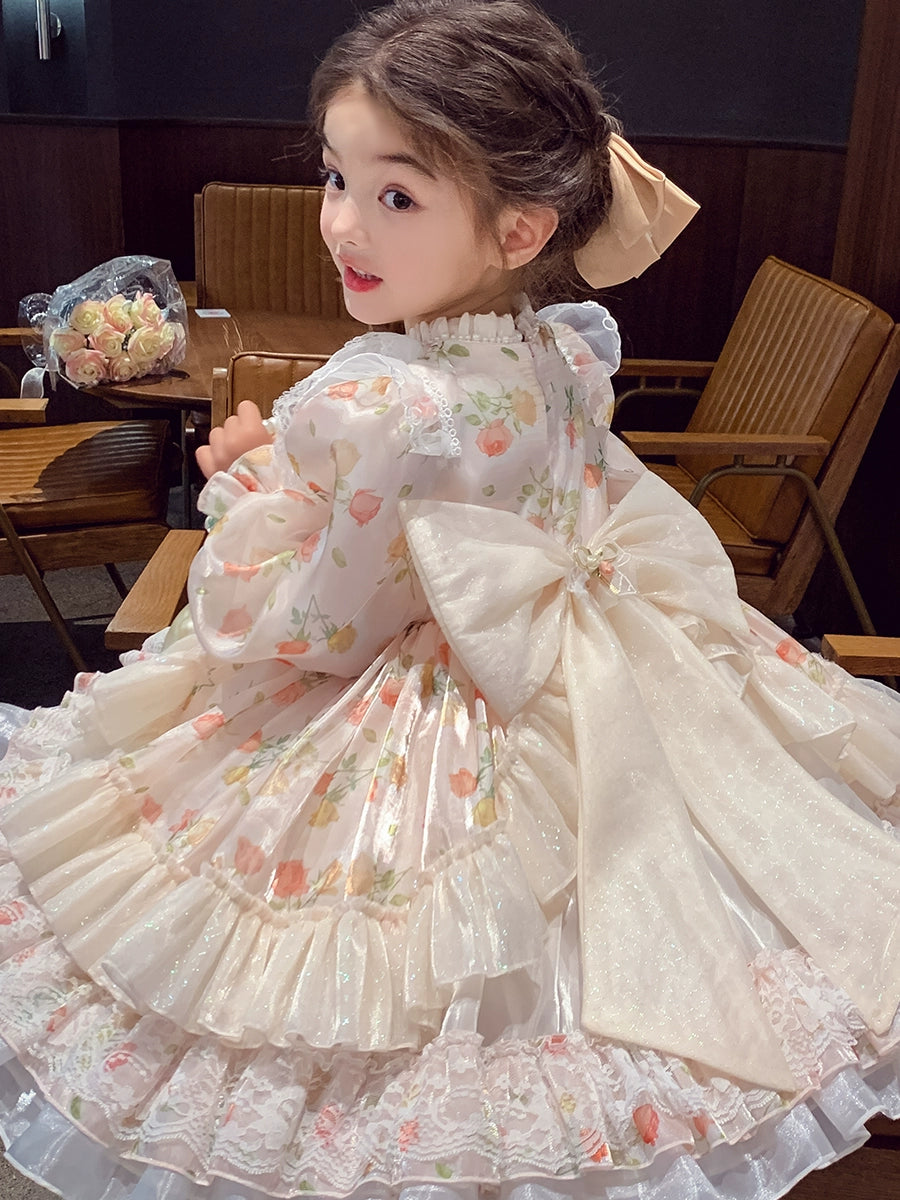 Details: The dress features a multi-tiered skirt with intricate lace borders and ruffled trims, adding depth and elegance. Floral patterns and delicate embroidery are prominently displayed throughout the design, bringing a whimsical and romantic touch. The fabric is soft and structured, ensuring comfort and durability for extended wear. Coordinating elements such as the large decorative bow and lace trims enhance the cohesive and charming aesthetic of the dress.