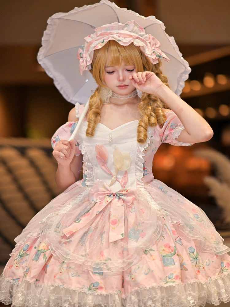 Design Elements: This Lolita JSK showcases a delightful ensemble with intricate lace embellishments and charming ruffled trims framing the neckline and sleeves. Oversized bows cinch the waist and trail along the hem, sculpting a graceful silhouette. Structured bodice and adjustable broad waist ties ensure both refinement and comfort, while the voluminous skirt balances opulence with mobility.