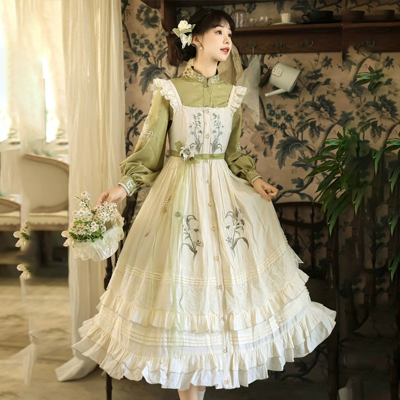 Design Elements: This charming vintage-inspired dress features a delightful floral embroidery print on its voluminous skirt. The bodice is a fitted, collared shirtwaist, crafted from a contrasting olive-green silk or brocade fabric. Delicate ruffled trims accentuate the neckline, sleeves, and front placket, while long puff sleeves lend a classic, romantic flair. The skirt showcases tiered layers and a cinched waistline, creating a timeless, feminine silhouette.