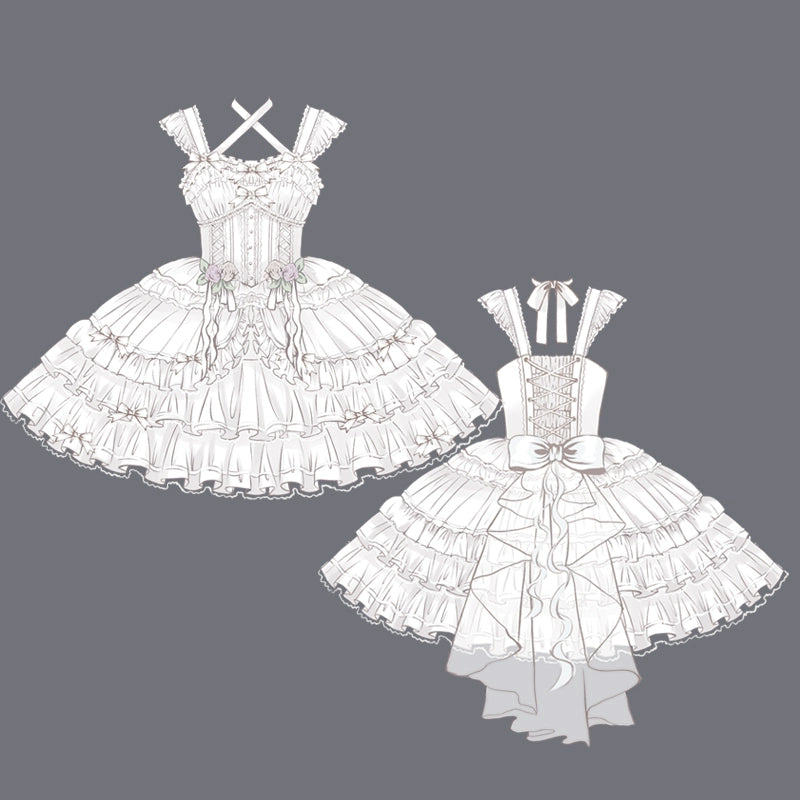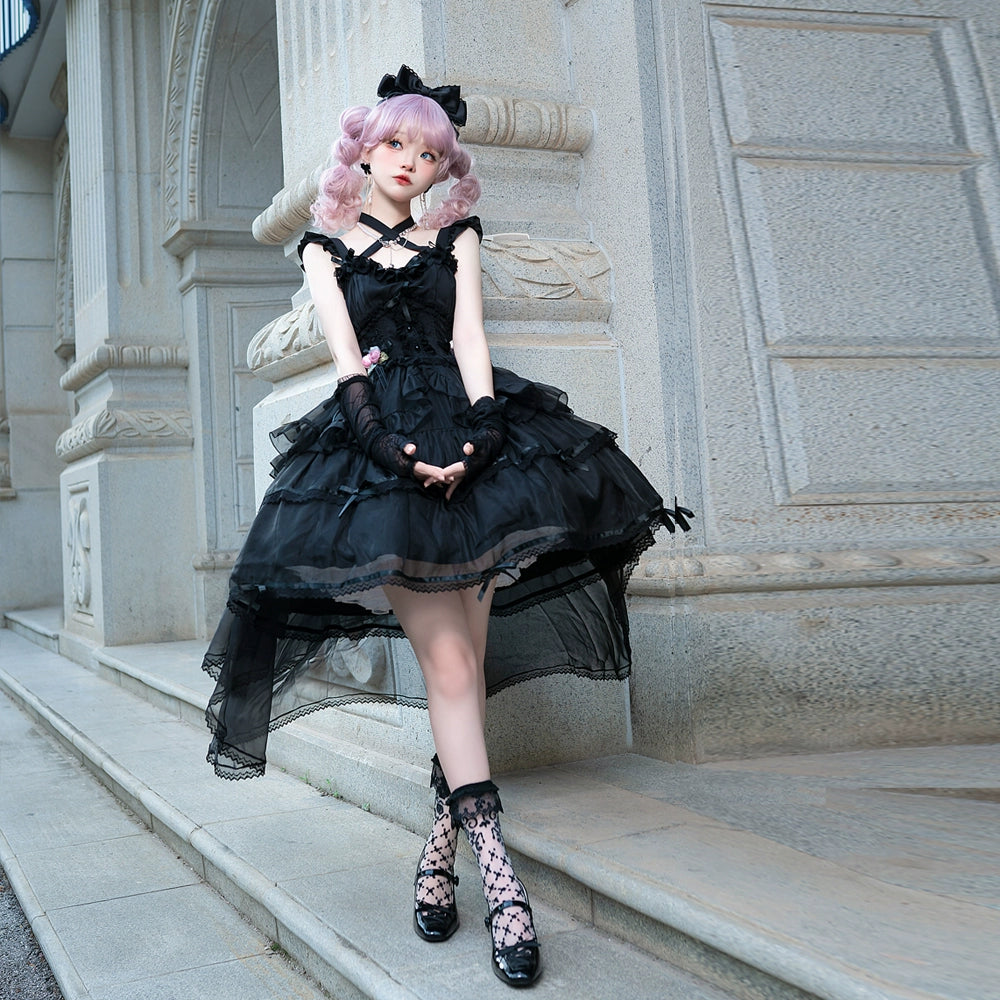 Design Elements: This enchanting Lolita JSK boasts a delicate floral and ribbon-inspired design. The square-neck bodice features crisscross lace straps and tiered ruffled layers that create a structured yet romantic silhouette. Asymmetrical skirt hems with shorter front layers add playful movement, while large satin bows accentuate the waistline. Delicate guipure lace appliqués embellish the bodice and overlay the tulle skirt, blending vintage charm with modern elegance. The lightweight fabric ensures fluidity, perfect for graceful movement.
