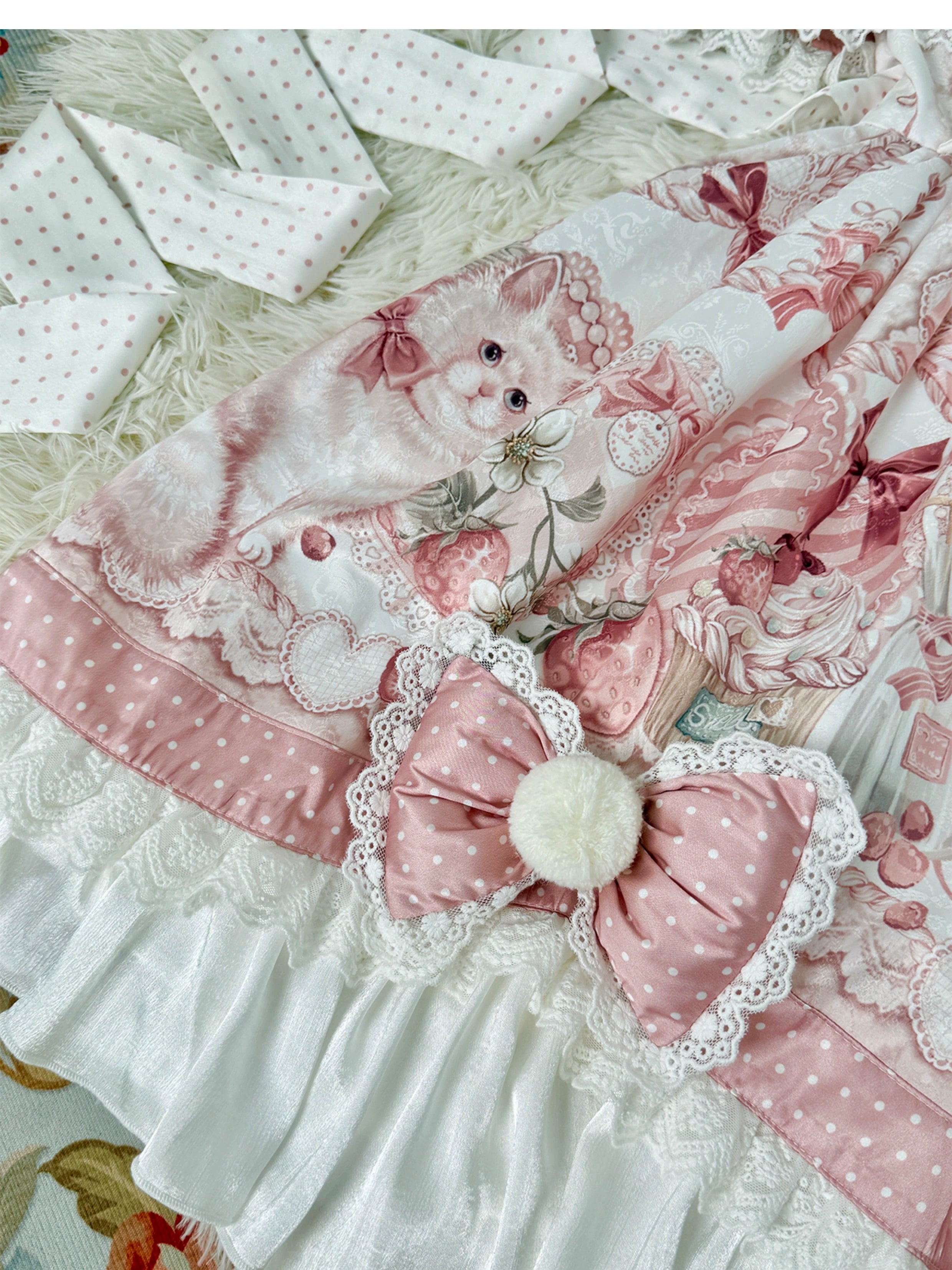 Details: The voluminous skirt boasts intricate floral embroidery and scattered teddy bear motifs, blending sweetness with refinement. An optional detachable capelet, trimmed with fluffy pom-poms and lace, drapes gracefully over the shoulders for added drama. The inner lining ensures comfort, while the structured overlayer maintains a flawless, twirl-worthy shape. Delicate pearl-like beads are subtly embroidered near the bows, adding a touch of subtle shimmer. Coordinating accessories, such as a matching bow headband and wrist cuffs with dangling ribbons, complete the ensemble’s cohesive, storybook charm.