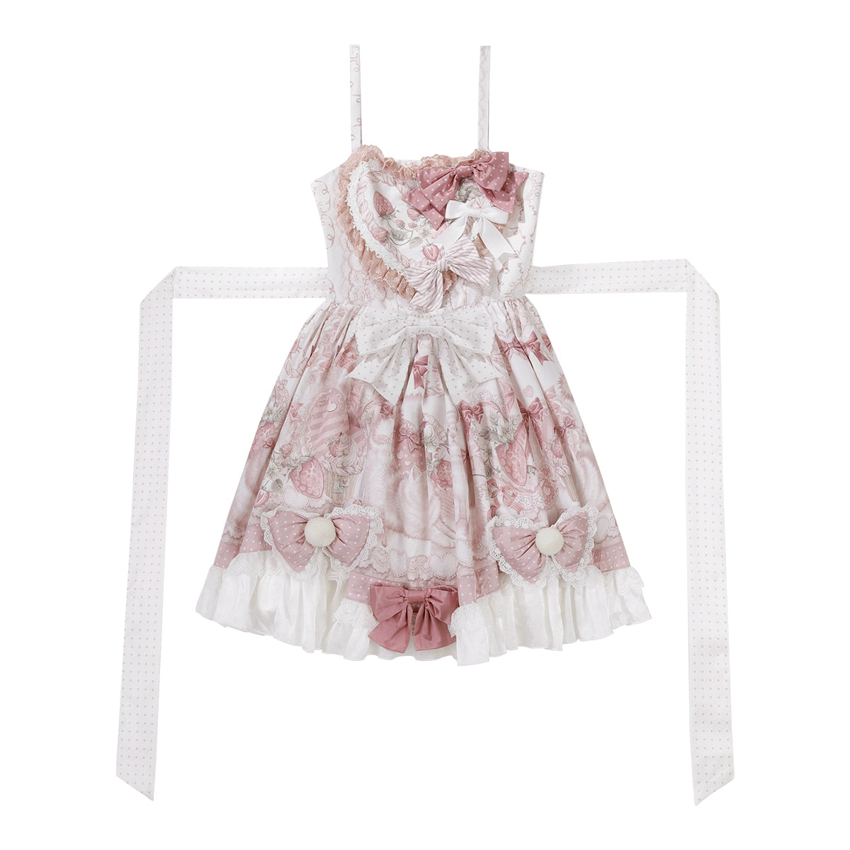 Design Elements: This Lolita JSK showcases an enchanting pink and white color palette, featuring a delicate floral and bow print. The bodice is elegantly structured with layers of fine lace overlaying tulle, creating a soft, ethereal texture. Ruffled trims accentuate the high neckline and long, sheer puff sleeves, which are finished with fluffy faux fur cuffs. A statement oversized bow crowns the waist, while a shorter complementary bow graces the skirt's hip, enhancing the romantic silhouette. The hemline is lavishly adorned with multiple tiers of ruffled lace and delicate tulle, adding dimension and movement.