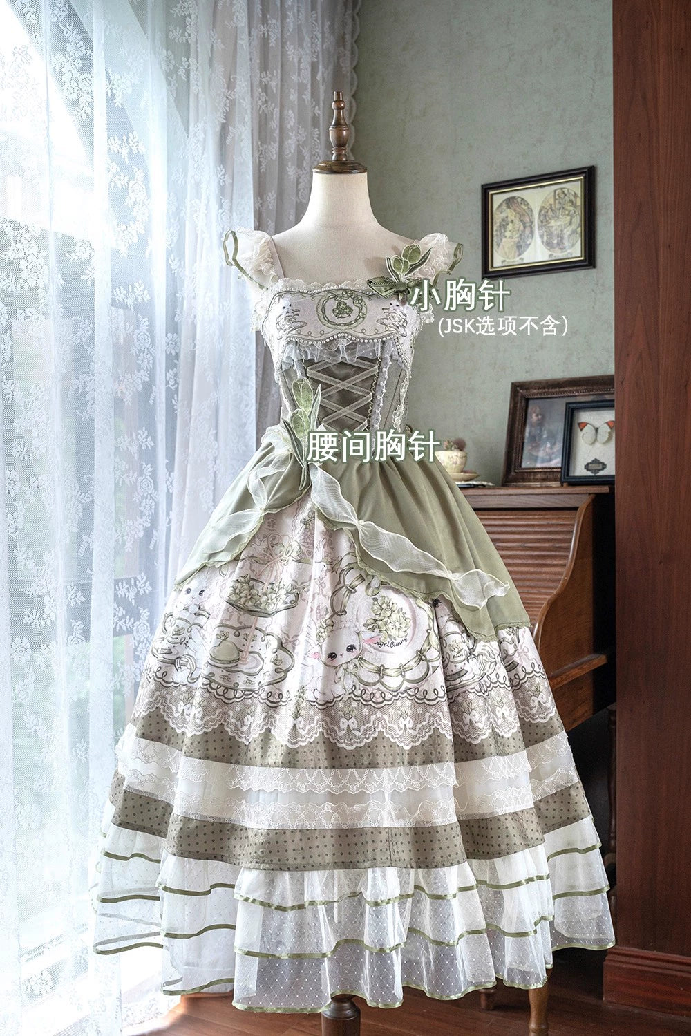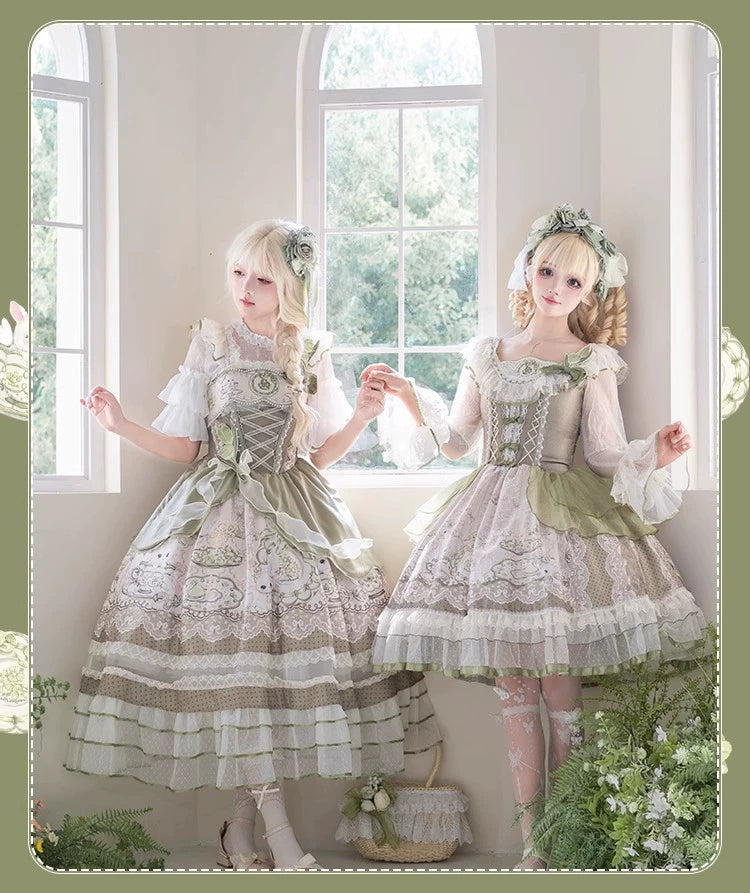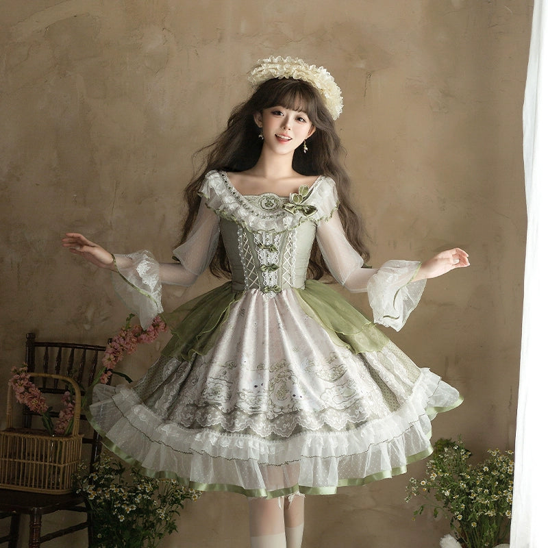 Design Elements: This Lolita JSK features a soft green or white-green color palette with a vintage-sweet aesthetic. The bodice has delicate lace detailing and ruffled trims along the neckline and sleeves, with a structured square neckline (second JSK). A gathered waistline is accented by charming bows, enhancing the feminine silhouette. The multi-layered skirt boasts lush volume with lace and ruffled edges, while the sheer overlay (first JSK) adds ethereal lightness.