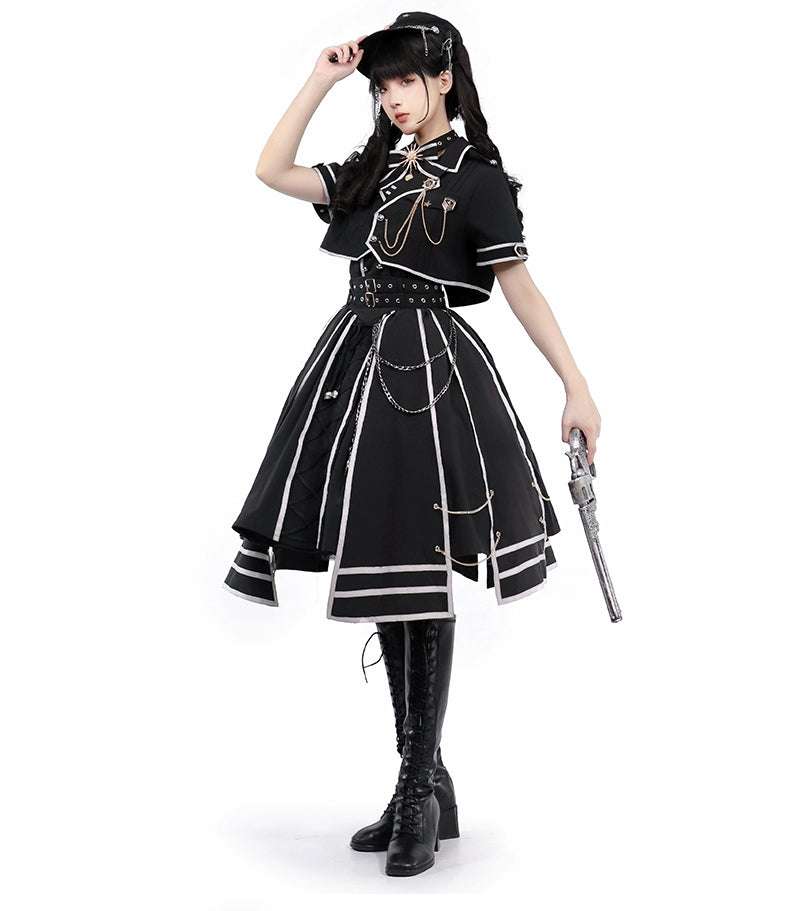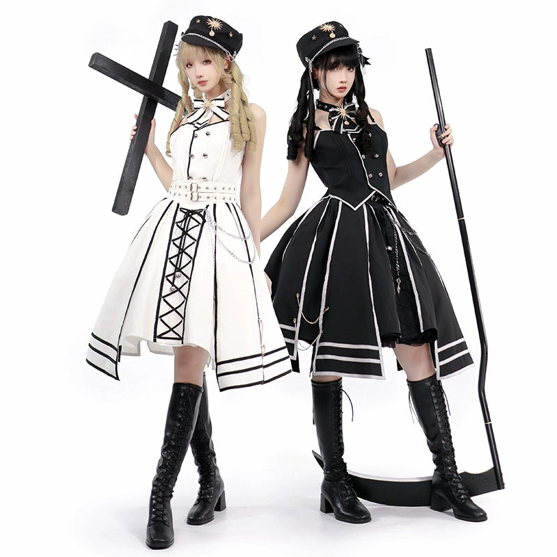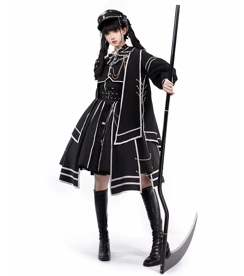 Design Elements: This pair of Gothic - Lolita style clothing sets features a striking black - and - white color scheme. The jackets have a structured silhouette with sharp, angular lines that give them a bold and edgy look. Delicate chain details are added, running vertically along the front of the jackets, adding a touch of industrial charm.