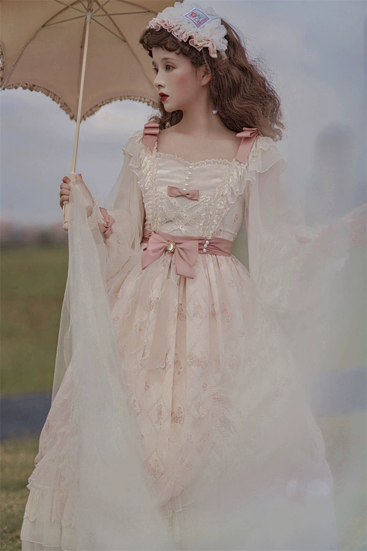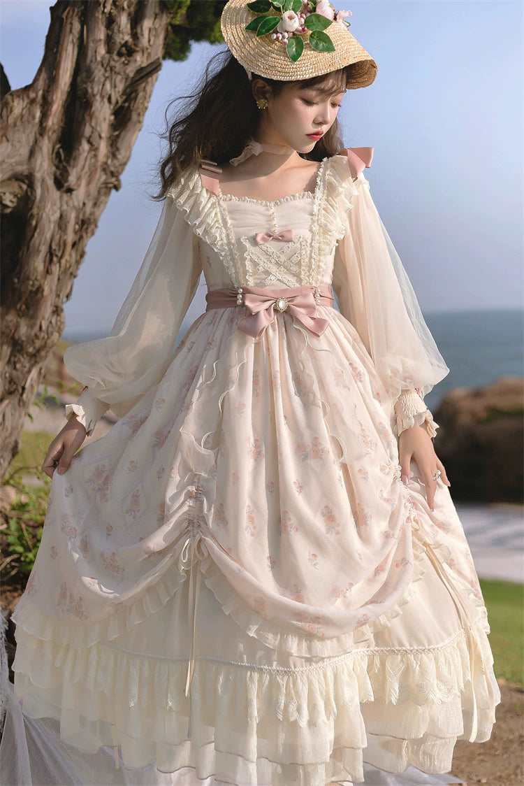 Design Elements: This Lolita dress boasts a soft, creamy hue that exudes elegance and grace. The bodice is intricately designed with delicate lace and floral embroidery, creating a romantic and vintage aesthetic. The neckline is adorned with a soft pink ribbon, adding a touch of femininity. The skirt is multi-layered, with ruffled edges that add volume and a whimsical touch. The overall design is both charming and sophisticated.