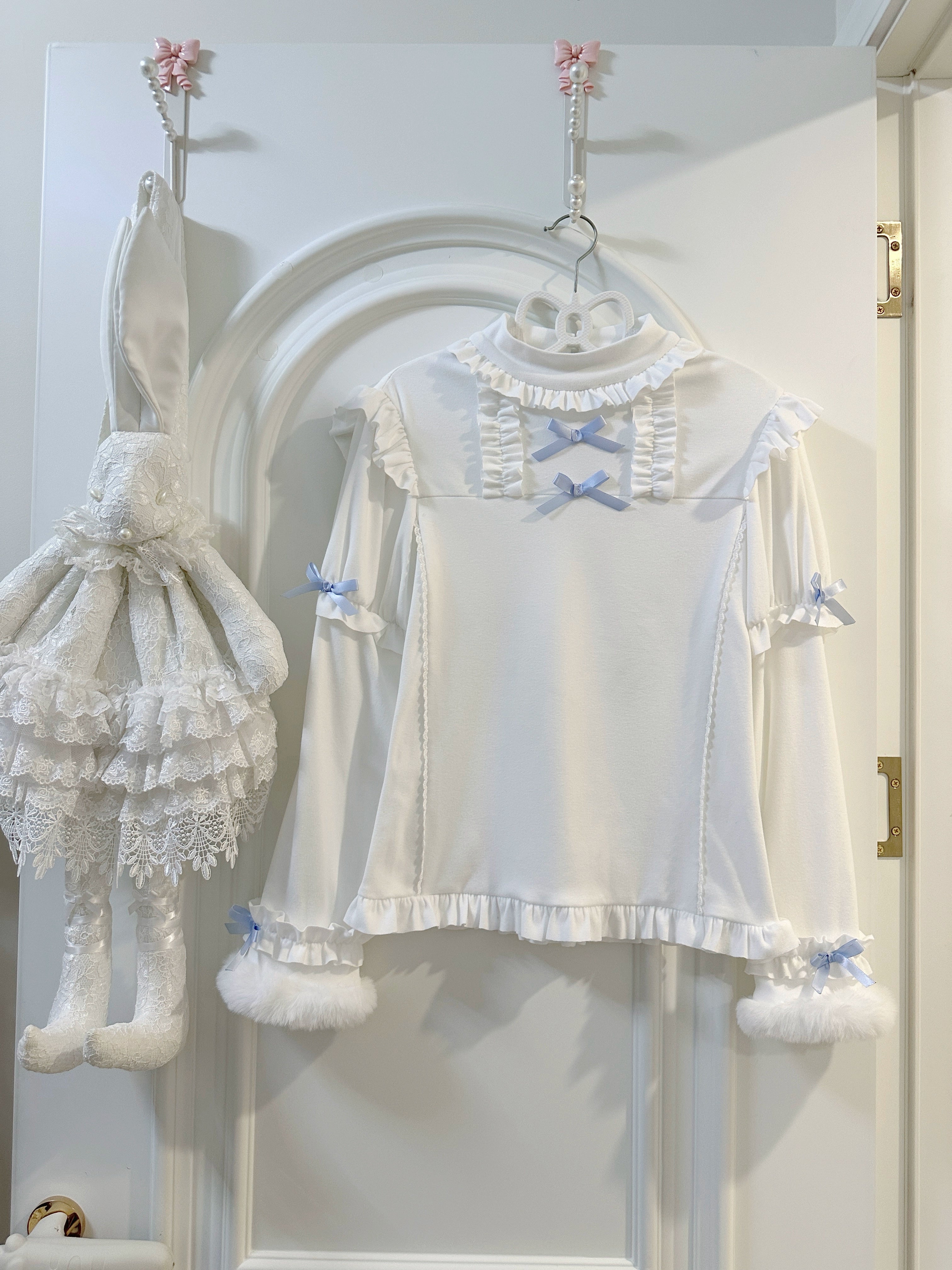 Design Elements: This enchanting Lolita JSK showcases an adorable teddy bear print set against a dreamy pastel backdrop. The bodice boasts a pristine white base with intricate lace overlays, complemented by fluffy ruffled cuffs and a Victorian-inspired Peter Pan collar. Delicate ribbon lacing cinches the waist, while oversized bows in soft blue hue adorn the neckline, front panels, and waistline, creating a harmonious balance of structure and whimsy.