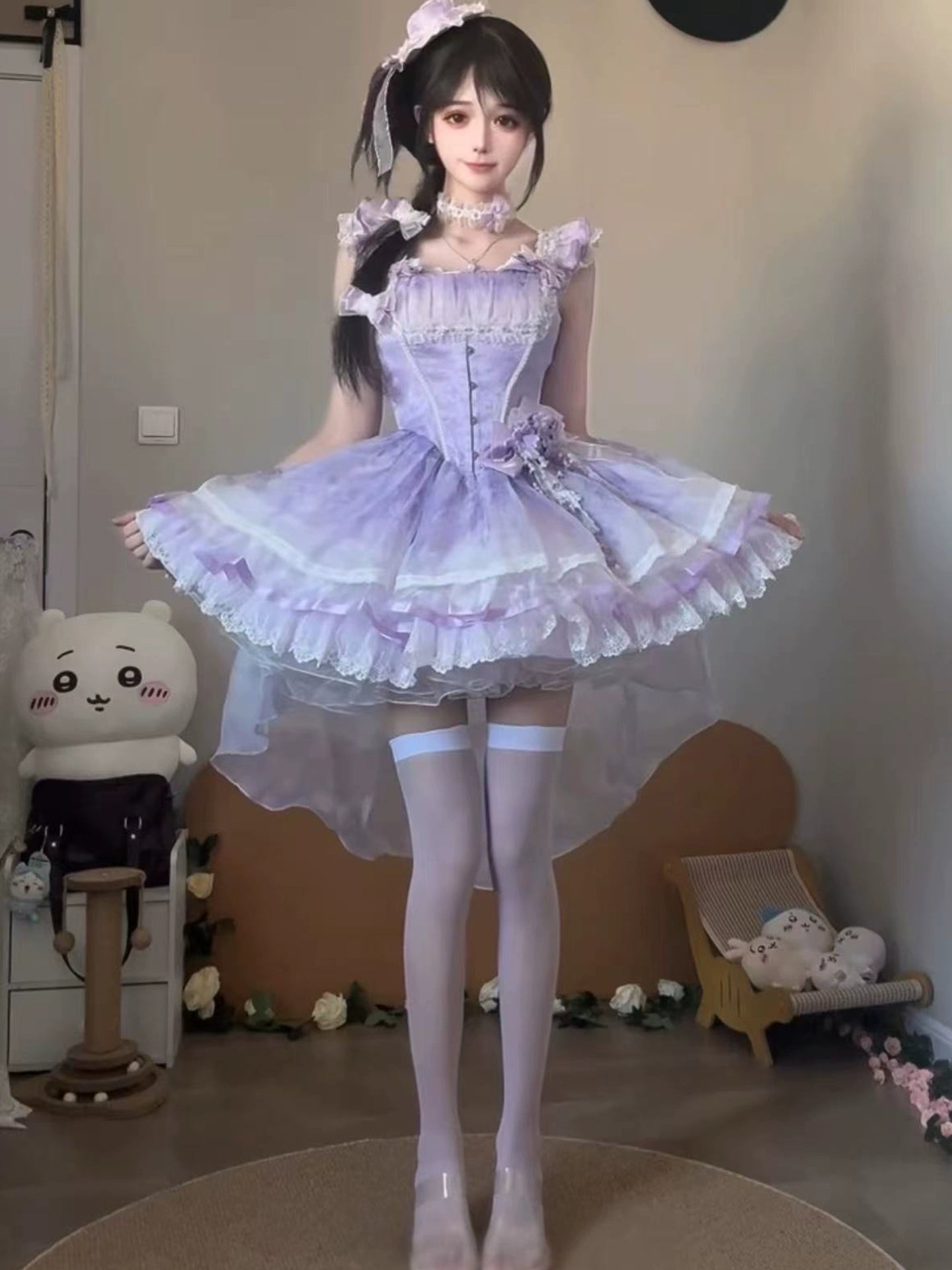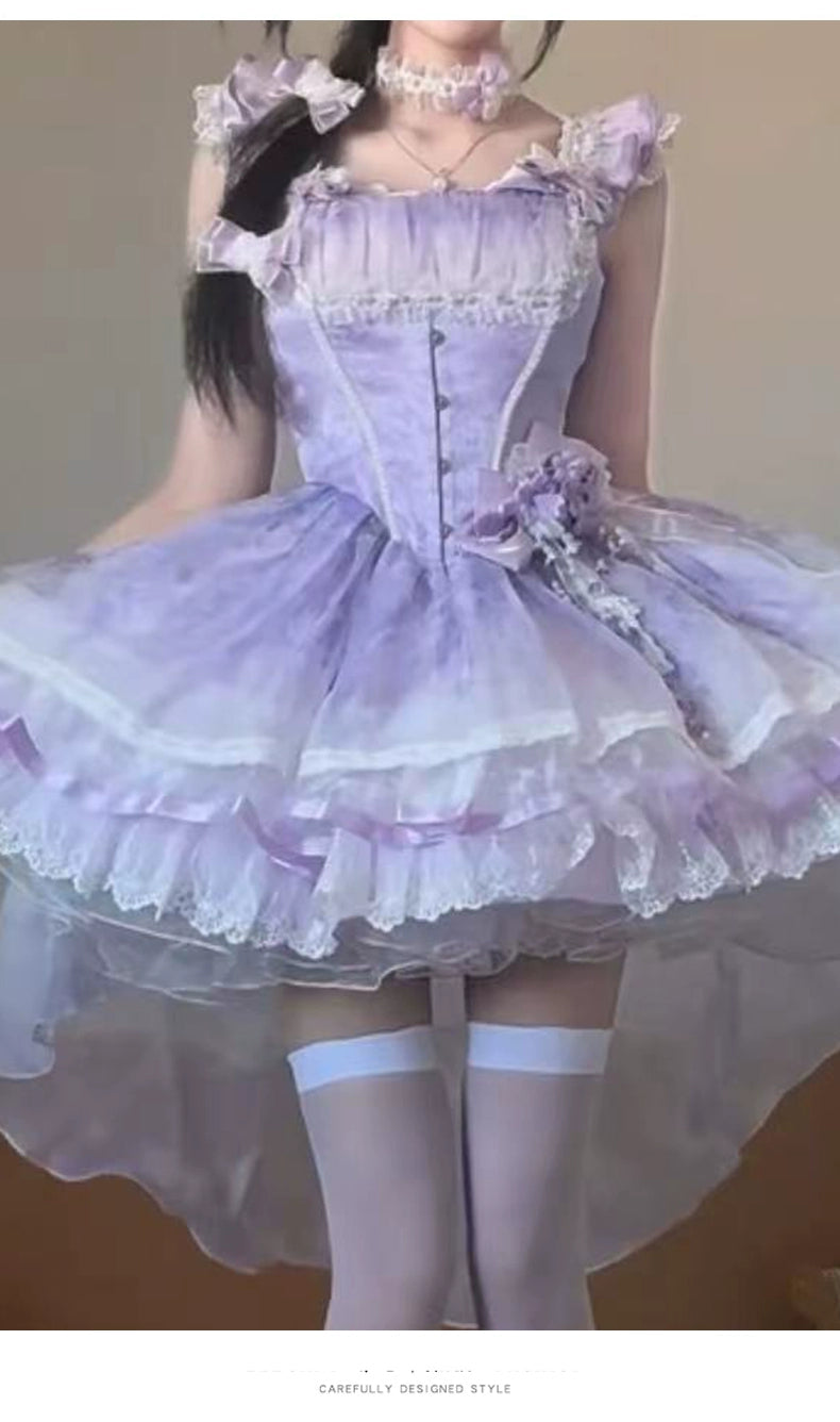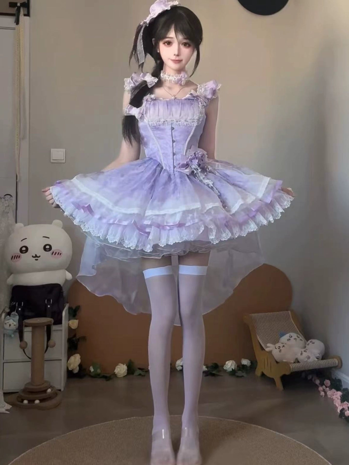 Design Elements: This enchanting Lolita - style JSK showcases a dreamy lavender color scheme. The off - the - shoulder bodice is elegantly trimmed with delicate lace and small floral appliqués. It features a sweetheart neckline that flatters the figure. The voluminous skirt is a masterpiece of layers, with tulle and ruffled trims creating a sense of airiness. The skirt has a high - low hem, adding a dramatic flair. Soft pastel purple ribbons adorn the waist and hem, enhancing its romantic allure. The overall design exudes a fairy - tale charm, making it perfect for cosplay or themed parties.